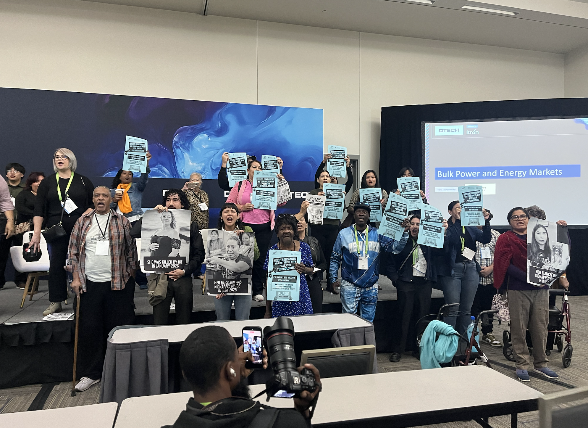 "A few dozen protesters brought a charged jolt to a morning panel at the DTECH energy conference in San Diego yesterday, climbing onto the stage and chasing PG&E's vice president for wildfire mitigation away from the podium. Activists packed the front of the room with blue signs and loud chants, forcing panelists to step down while the moderator urged the audience to clear out. The disruption halted a session billed as a discussion of technologies for locating and identifying wildfires."